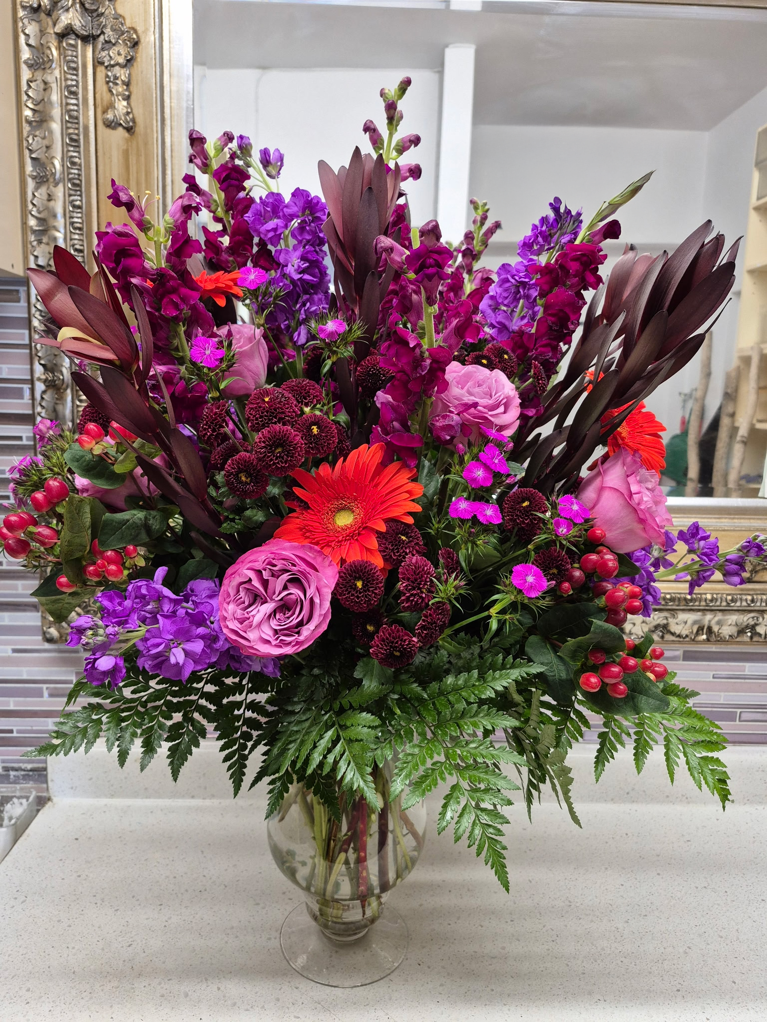 Bouquet de fleurs composé de leucadendrons, giroflées mauves et rouges, roses de jardins mauves accompagnés d'hypericum rouges.