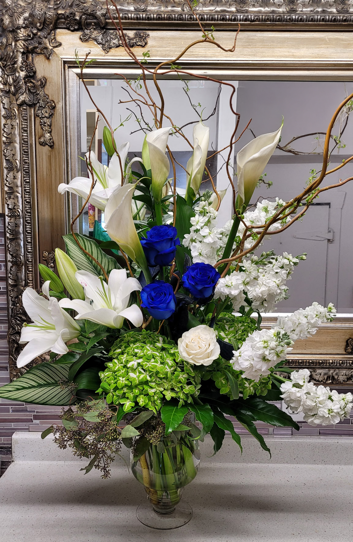 Bouquet de fleurs composé de lys blancs, roses blanches et bleus, hydrangées verts et giroflées blancs.