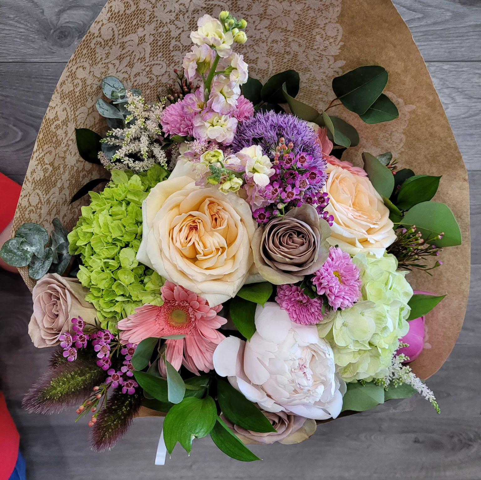 Bouquet de fleurs composé de roses de jardin crèmes, alium mauve, hydrangées verts, pivoines roses, roses sables et gerberas roses.