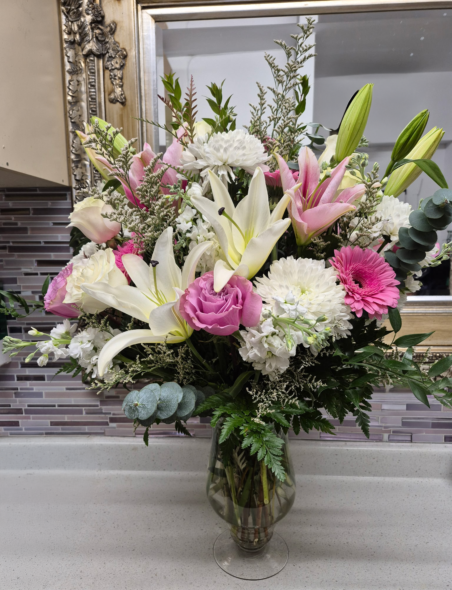 Bouquet de fleurs composé de lys blancs, roses de jardin roses et blanches, gerberas roses ainsi que giroflées et crémons blancs.